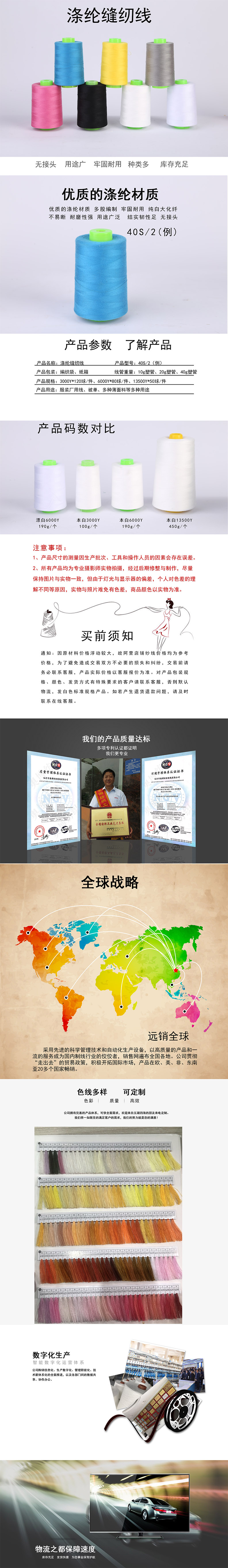 采用YCF涤纶纤维为原料,经过纺、捻、染等程序,条杆均匀,颜色丰富,一般用于服装面料、针织面料、床垫、箱包等的缝纫和装饰。