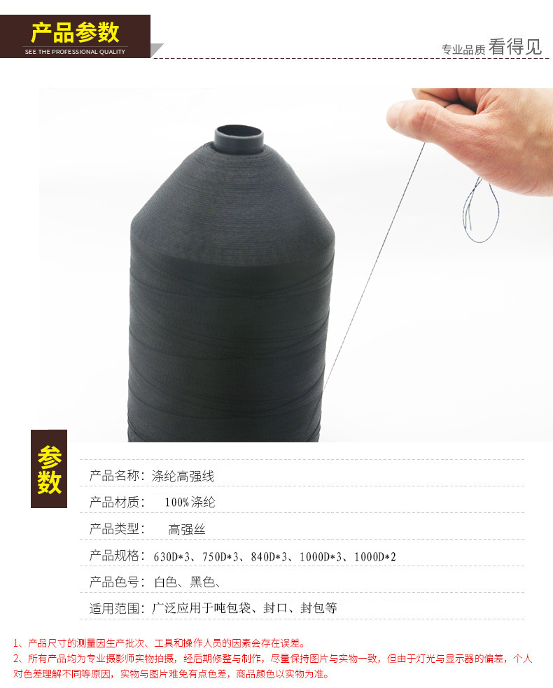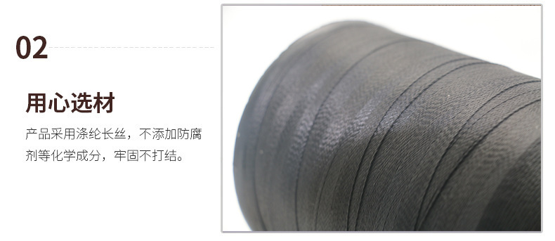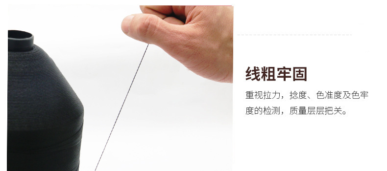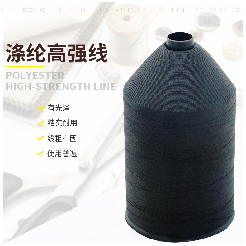 涤纶高强线采用涤纶长丝为原料,强度高、弹性好、耐磨耐高温、化学稳定性好,有极好的光泽和强力。主要适用于皮革类缝纫,常用在沙发床垫、帐篷、家具、皮革制品、劳保用品等领域。